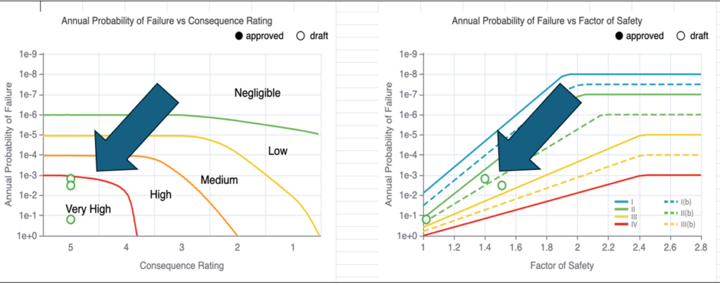 The Probability of Failure is derived from Factor of Safety calculations modified by a Level of Practice score. The Level of Practice (LOP) is a measure of the integrity and quality of data used to design and manage a mine facility. A dam with a Factor of Safety of 1.2 will have a different Annual Failure Probability depending if the design & operation are highly credible (a high LOP) versus a design & operation based on limited field data and technical rigor (low LOP).