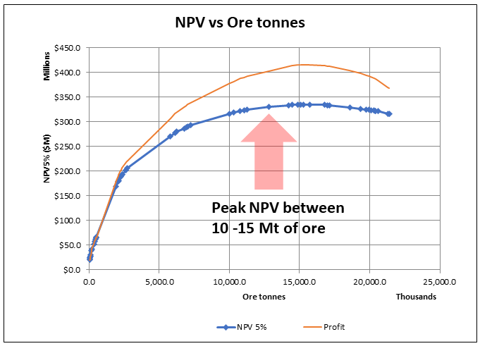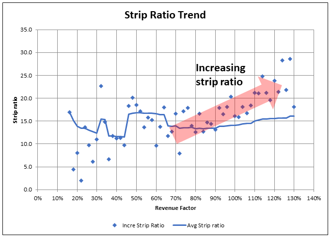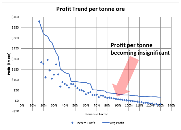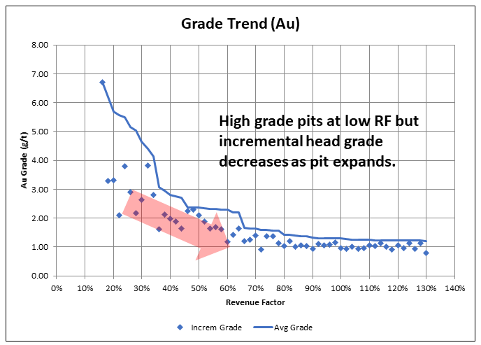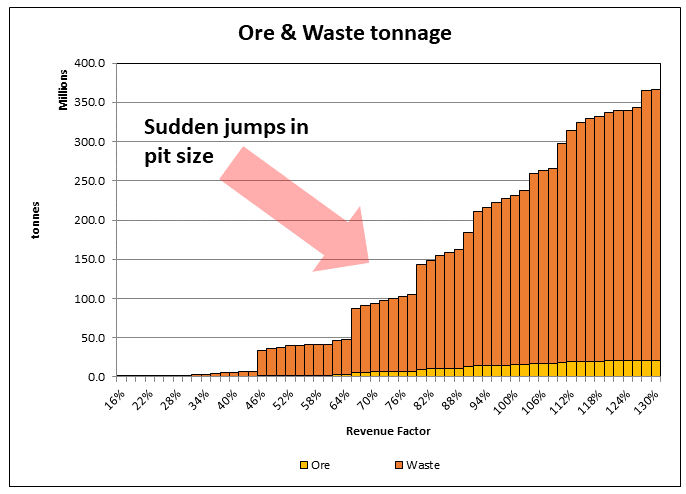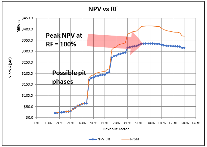 Often in 43-101 technical reports, when it comes to pit optimization, one is presented with the basic “NPV vs Revenue Factor (RF)” curve. That’s it.