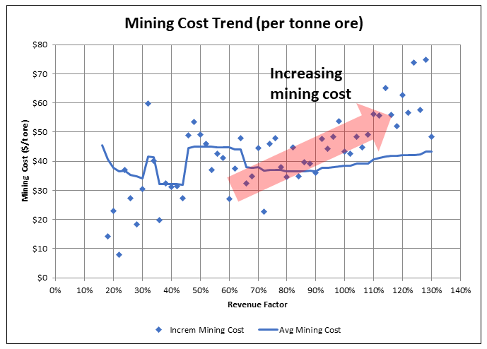 Before starting pit optimization, we require economic inputs from several people. The base case metal prices must be selected (normally with input from the client). The mining operating cost per tonne must be estimated (by the mining engineer). The processing engineers will provide the processing cost and recovery for each ore type.