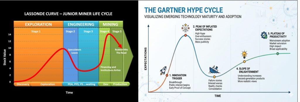 Both sectors can follow the “Lassonde Curve” (mining) or the “Hype Cycle” (tech). There is an initial surge of excitement during discovery/launch, followed by a “boring” period of technical de-risking (development/user acquisition), and finally a re-rating once they reach production or profitability. (More on the Lassonde Curve later in this blog post).